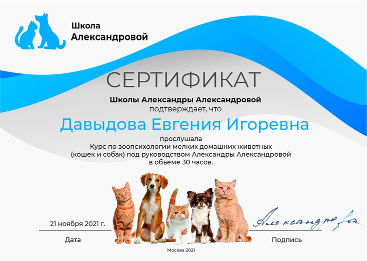 Сертифицированный зоопсихолог Давыдова Евгения. Окончила курсы по зоопсихологии Александры Александровой - зоопсихолога, ветеринарного врача и ведущего программы "Кто в доме хозяин?". Евгения постоянно развивается, изучает новую информацию.